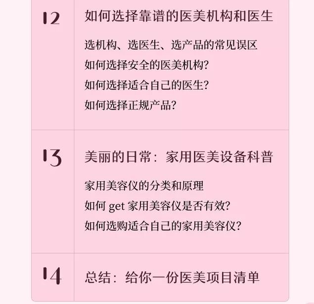 4)针对同一问题的不同项目(比如点阵激光/红宝石激光/果酸焕肤都能治疗色斑)区别在哪里课程共14节,每节课10-15分钟,有文稿、有音频。在路上、在家里,抽个空就能听一节。