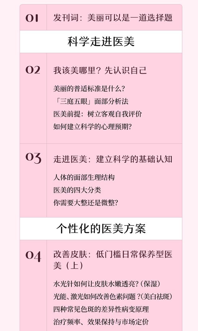 1)建立理性认知、了解相关知识、不会轻易被商家误导2)学会皮肤改善、对抗初老、轮廓调整、身体塑形4大方面的医美方案3)学会怎么选医院、选项目、挑产品……等接地气的实操知识