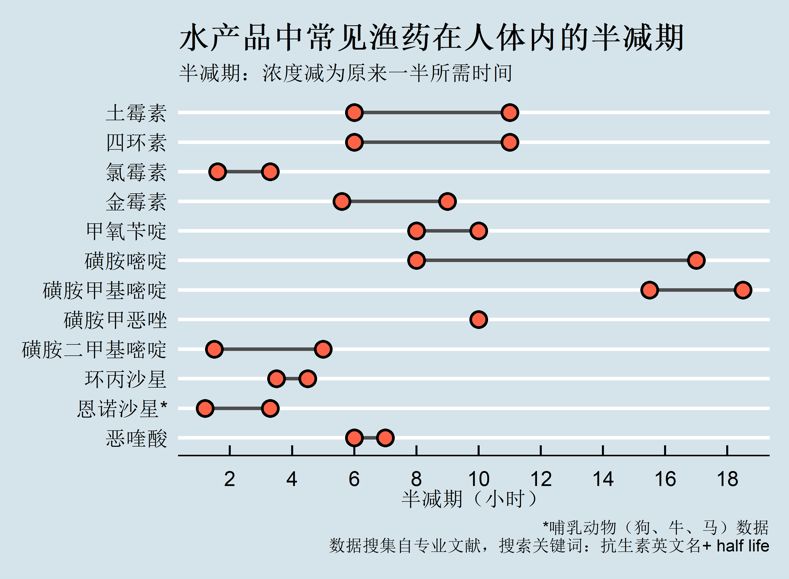 抗生素生物半减期短,这一特性为其低风险提供了双重的保障:一,如果海鲜在上市之前有足够长的休药期,例如一个星期,抗生素就不大可能超标。二,即使超标了,人体在吸收后也会很快将其排出体外,不会蓄积。