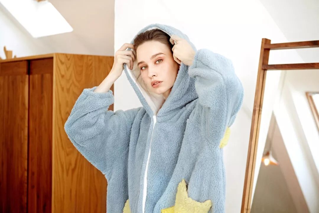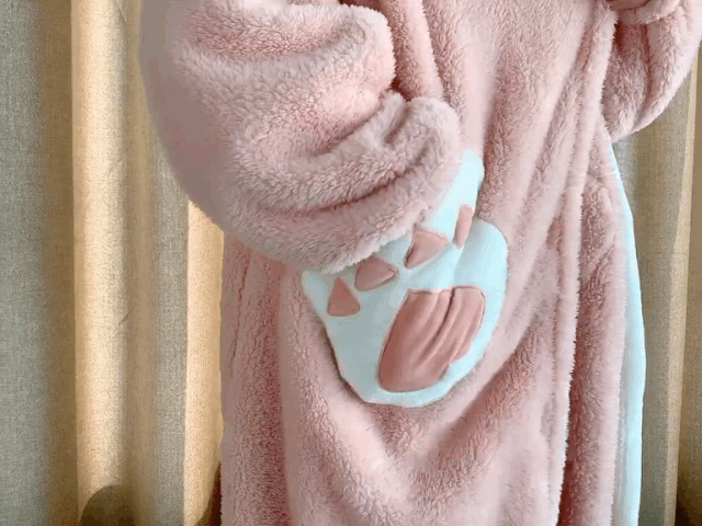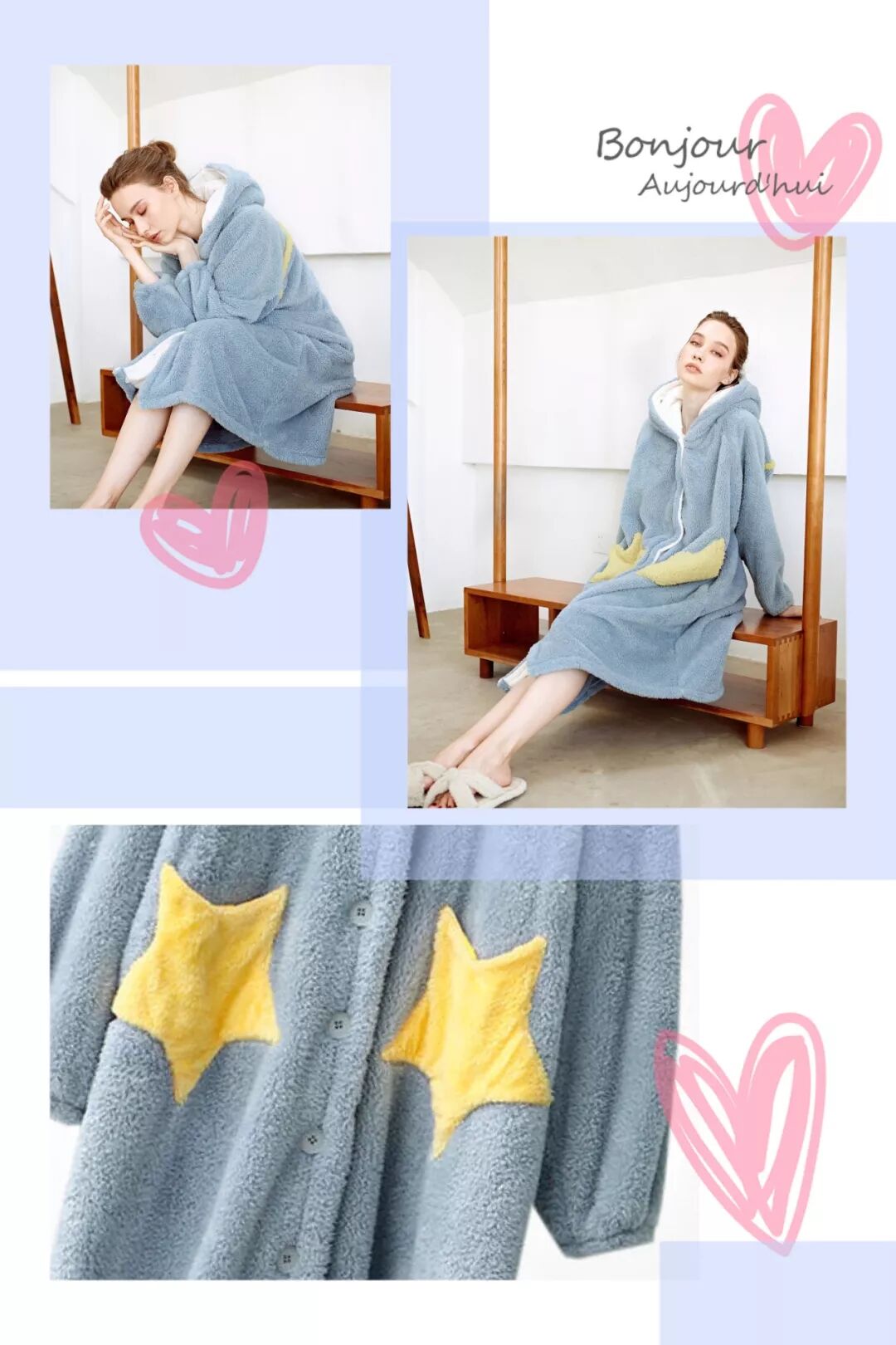 连帽的款式,长度到小腿,挡风御寒,可盐可甜,就算外出穿也没什么不可以~