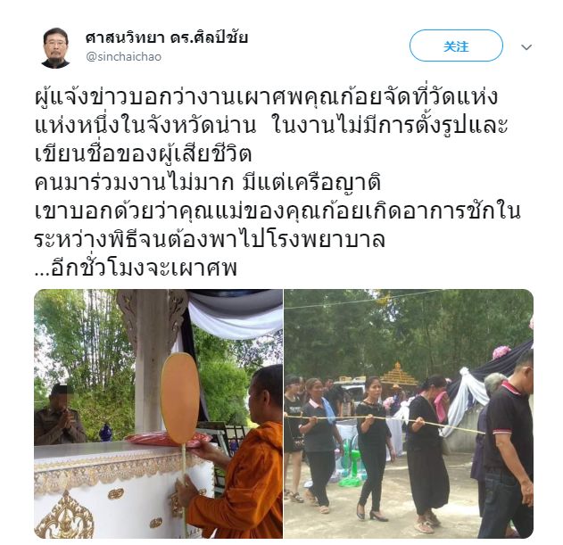 泰国媒体人@sinchaichao 的一条推文说,有线人称诗妮娜的葬礼已经在偏远的寺庙里举办。葬礼上没有死者的照片,参加的人并不多,但有诗妮娜的亲属。诗妮娜的母亲当场癫痫发作,被送往医院。