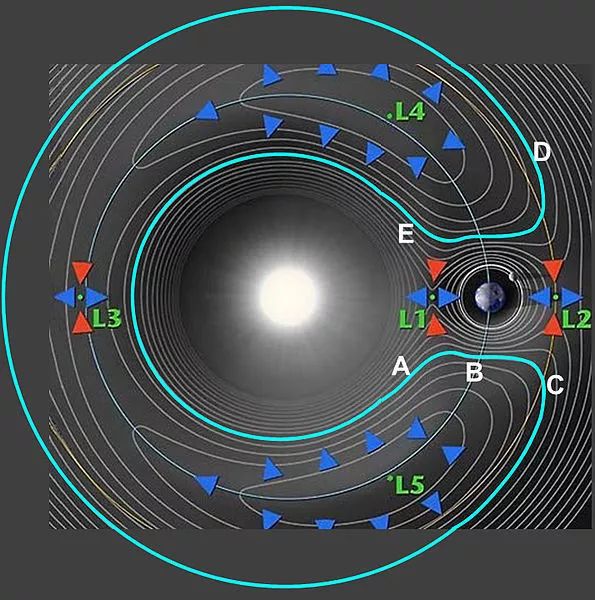 马蹄形轨道(青色线圈定的区域),和准卫星轨道同为1:1轨道共振模式中的一种 | 维基