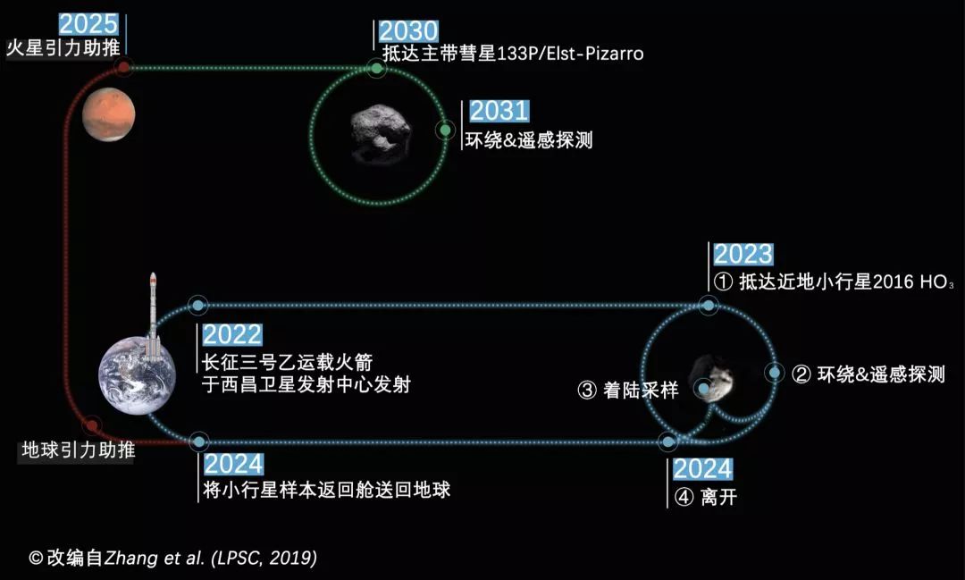 2023年抵达近地小行星2016 HO3,环绕这颗小行星进行一系列近距离遥感探测,并择机采集10克以上的小行星样本;
