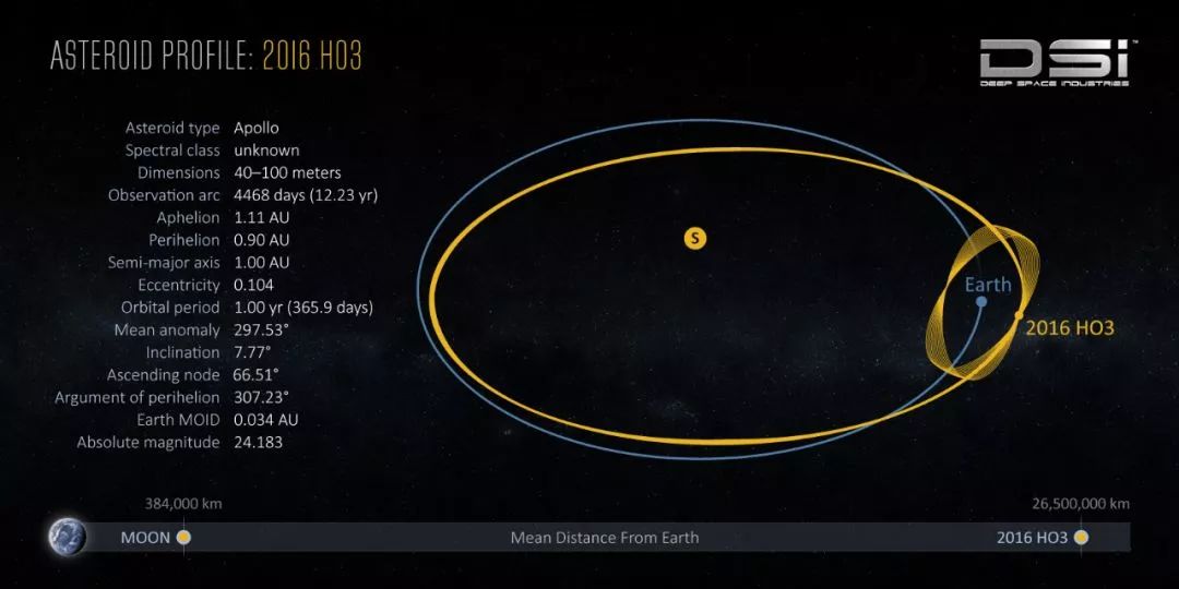 近地小行星 2016 HO3是一颗阿波罗型小行星,这类小行星会运行到地球轨道内部去,因此有时会非常靠近地球,是从地球出发的探测器比较容易在短时间内探访的一类小行星。JAXA的隼鸟号当年探访的糸川(25143 Itokawa)、隼鸟2号正在探访的龙宫(162173 Ryugu)、NASA的冥王号正在探访的贝努(101955 Bennu),都是阿波罗型小行星。