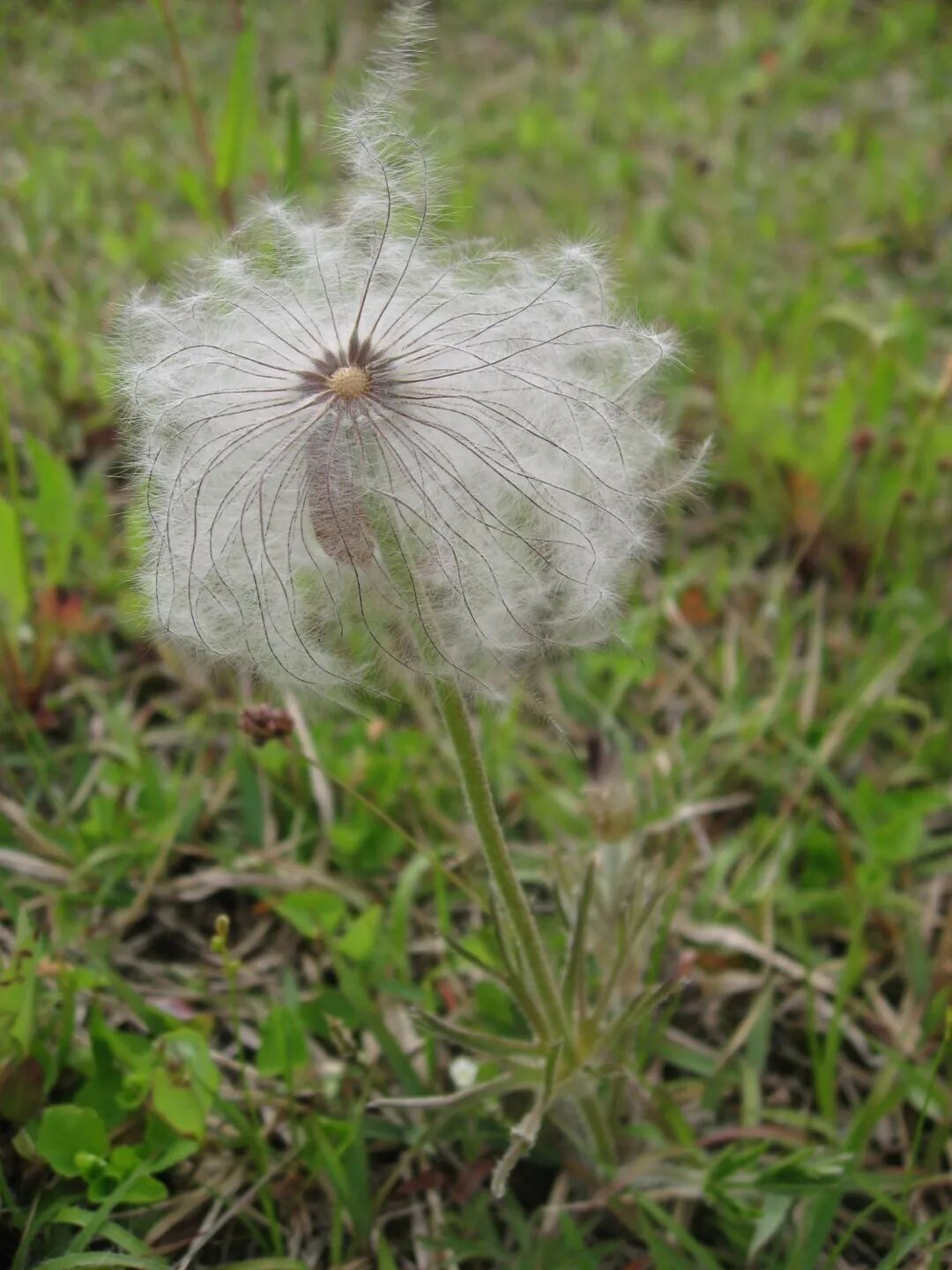 Pulsatilla这个属的植物,中文叫白头翁,日文叫翁草,说的都是它的果子。白头翁属和很多其它毛茛科植物一样,果实是聚合瘦果,也就是很多个坚硬的小瘦果长在一起。每个果子上还有一根羽毛状的宿存花柱,看上去就像是根白色长毛,聚在一起就像个蓬头乱发的白发老翁,《唐本草》里说它“正似白头老翁,故名焉”。