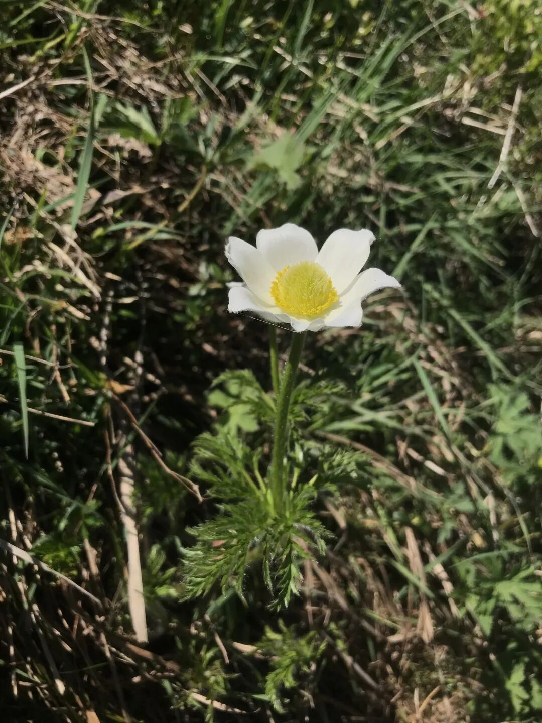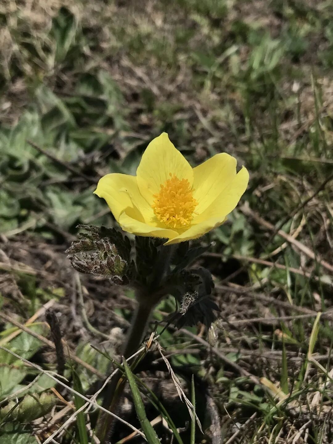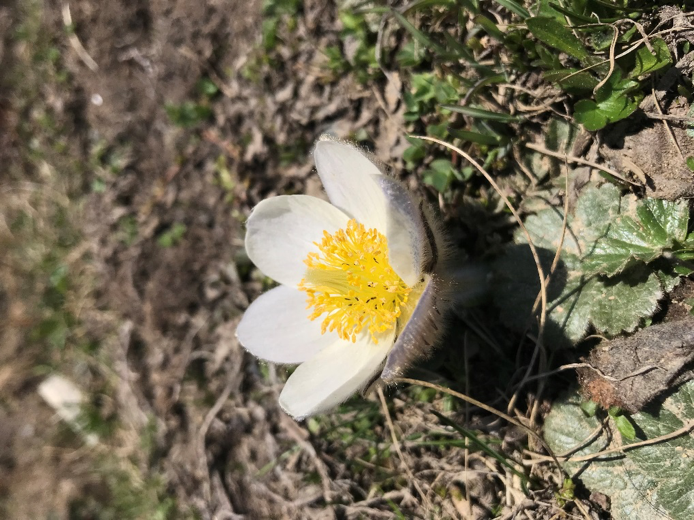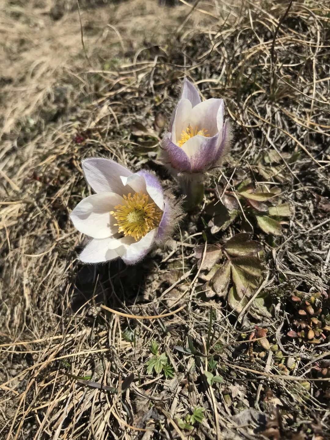 在这些野花中,就有我们这次见到的第一种白头翁——春白头翁Pulsatilla vernalis,它的种加词vernalis意思就是春天,英语中称呼它为lady of the snows——“雪女”。不过和日本传说中的妖怪雪女不同,春白头翁并不会把人冻住,只是在积雪旁边悄悄绽放。