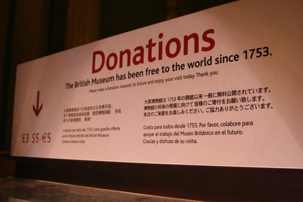 大英博物馆不出售门票,但在馆内设有捐款提示和募捐箱。图片:Nic McPhee / Wikimedia