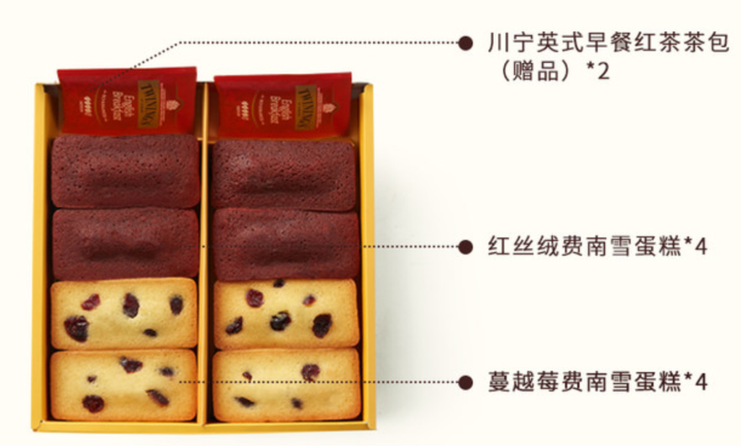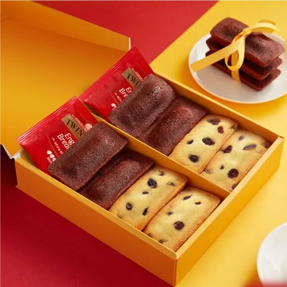 费南雪礼盒内还直接为大家搭配好了红茶茶包,是著名的英式茶代表TWININGS,冲泡方便。4块红丝绒+4块蔓越莓+2袋红茶,配置齐全。不论是买来自己吃,还是送人,都很适合~