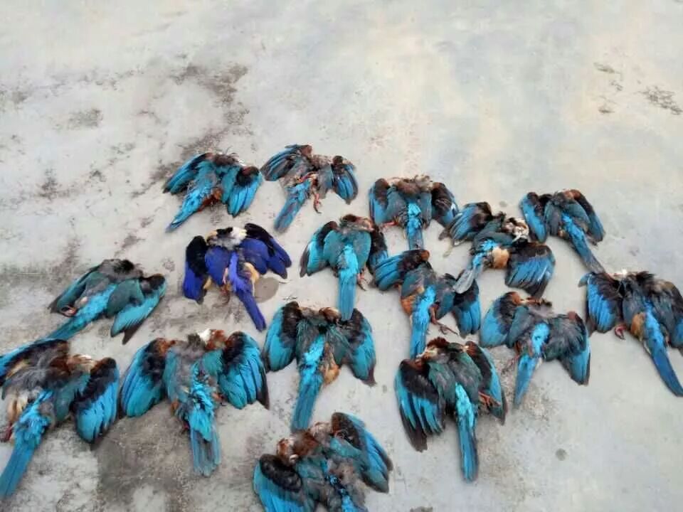 翠鸟卖家展示的翠鸟尸体,其中蓝色的翠鸟为蓝翡翠(Halcyon pileata)。图片:雪明明(化名)
