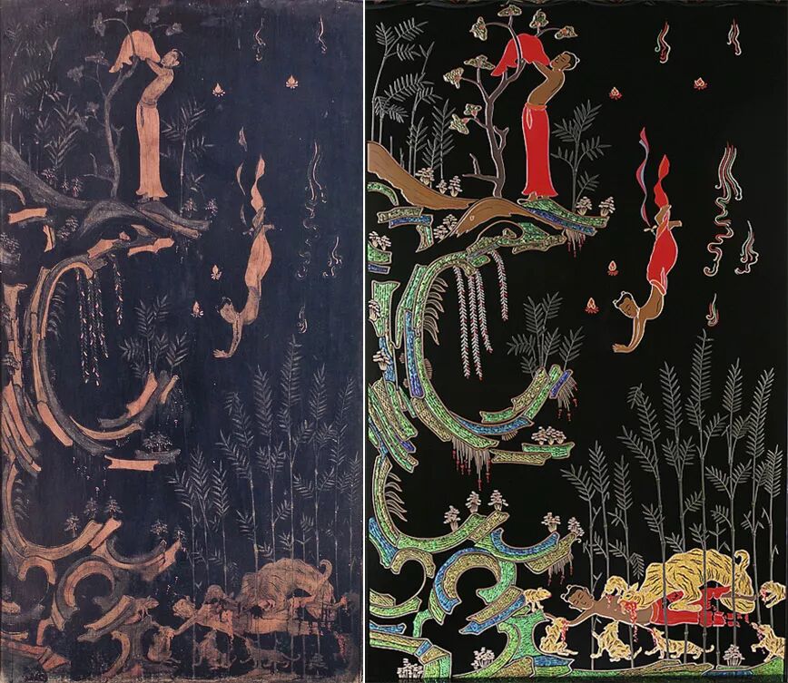 左:飞鸟时代玉虫厨子局部《舍身饲虎图》;右:现代复制品。其中山石部分为玉虫装饰。图片:高山市茶道美术馆