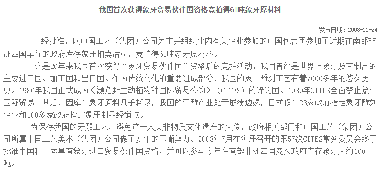 于是在多方斡旋下,2008年,津巴布韦、纳米比亚、博茨瓦纳和南非四国联合拍卖了108吨象牙,中方的中国工艺集团公司、北京牙雕厂、广州大新象牙工艺厂和北京猛犸艺术品公司四家企业共拍得61吨,合每公斤1083元。这也是1989年至今中国唯一合法获得的象牙原材。
