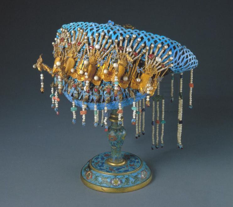 在中国,用翠羽装饰的工艺很早就出现了,比如“买椟还珠”的那个盒子就是“辑以羽翠”。从记载来看,古早的技法多是简单的粘贴或织绣,所以不易传世。我们现在能见到的点翠实物多是明清的,一个重要原因就是当时翠羽基本已经固定用在首饰上了,依托贵金属的载体能得到更好的保存。去北京或沈阳的故宫看看,那些流光溢彩的首饰,往往是点翠、镀金、花丝、镶嵌等多种工艺的结合。