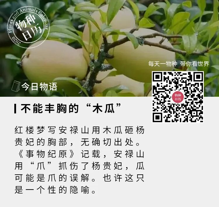 自汉以后以木瓜表现男女之情的文学作品比较少,印象里比较深刻的是《红楼梦》里贾宝玉进秦可卿闺房,房中便摆着一个“安禄山掷过伤了太真乳的木瓜”,不但是男女之情,而且是相当大胆的男女之情了。