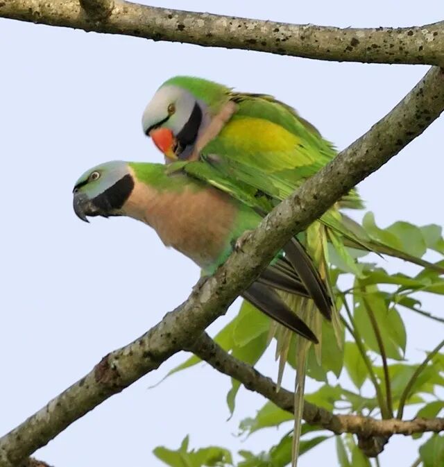 滑动查看图片,依次为大绯胸鹦鹉(也叫大紫胸鹦鹉,Psittacula derbiana)和小绯胸鹦鹉(也叫绯胸鹦鹉,Psittacula alexandri)。图片:Doug Janson、Lip Kee Yap / Wikimedia