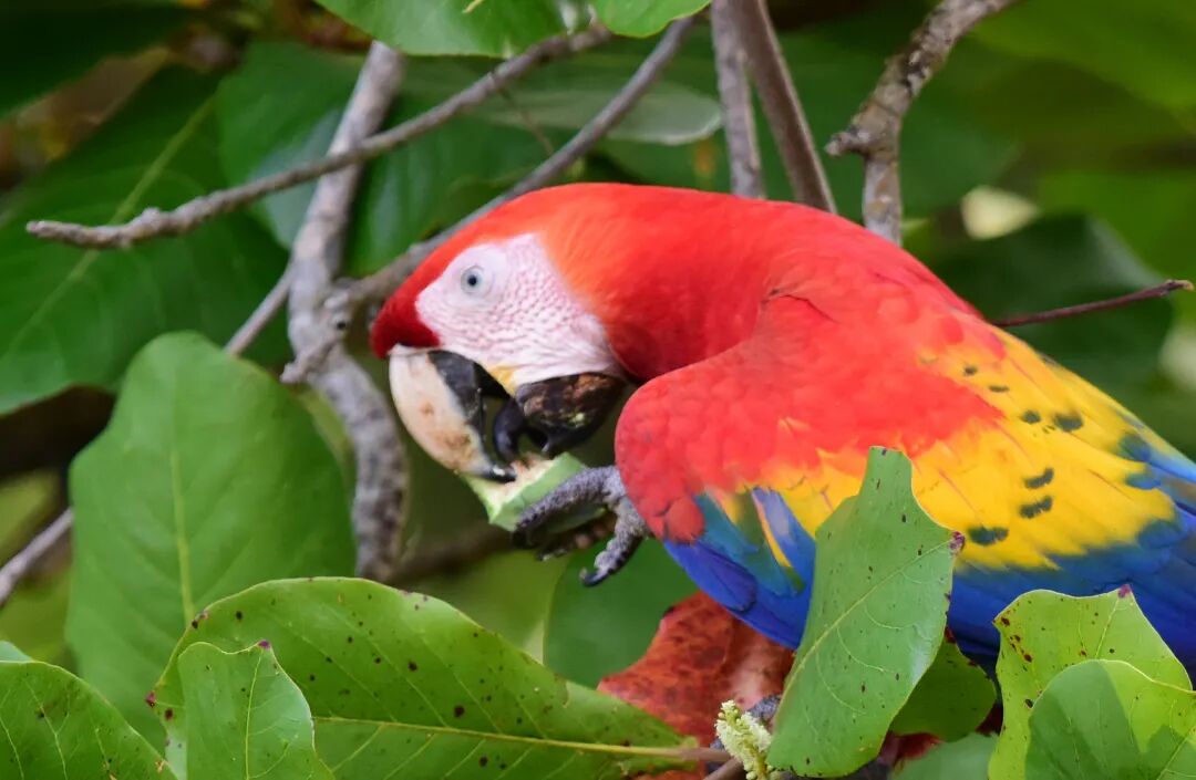 正在用脚拿着水果吃的绯红金刚鹦鹉。图片:Takashi Muramatsu / flickr