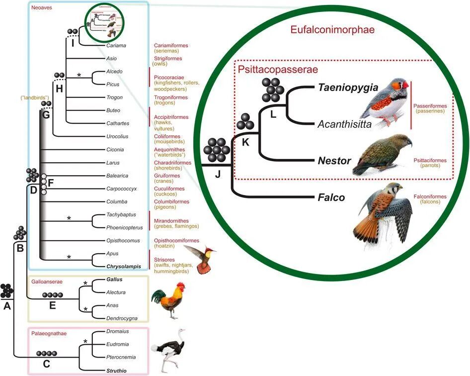 在新的研究中,鹦形目和雀形目被置于鹦雀总目(Psittacopasserae)下,和鹦雀总目关系最近的则为隼形目。图片:Alexander Suh / Nature Communications (2011)