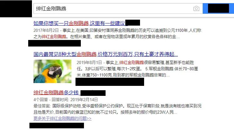 就在刚刚,我在国内某知名搜索引擎上搜索绯红金刚鹦鹉,搜索结果中“金刚鹦鹉多少钱”、“金刚鹦鹉价格上万至百万只有土豪才养得起”还有“如果你想买一只金刚鹦鹉,这里有一些建议”……这类条目占据了一大半。