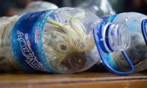 被装进塑料水瓶里走私的小葵花凤头鹦鹉。图片:Jefta Images / Barcroft Media