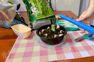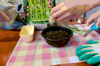 倒土,尽量倒满。倒土时多少会漏出来一些,于是我找到一张外卖的一次性桌布……