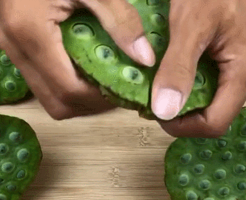 那时的莲蓬也没有现在饱满,往往是中央的莲子圆滚滚,周围有一些绿皮包空心,如果你把它们的皮剥开,也没有什么可以吃。不过,这样的空心莲子——我们叫“瞎子”——很好玩。咋玩呢?拿着它往额头上一磕,坚韧的莲子皮就“啪”的一声爆开。有意思的是,有的空心莲子一磕就爆,有的怎么磕都不响,所以,还得拼个人品。