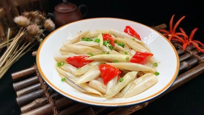 这藕带包括两个部分,尖尖的顶芽和其后的节间部分。若是要挑藕带,当挑靠近顶芽的,这部分最为鲜嫩,因为尖中有芽,所以吃起来口感也丰富一些。刚买回来的新鲜藕带包在袋子里,像许多根少女的手指,弥散出比藕更清新的甜香。掐一下,嘎吱作响。