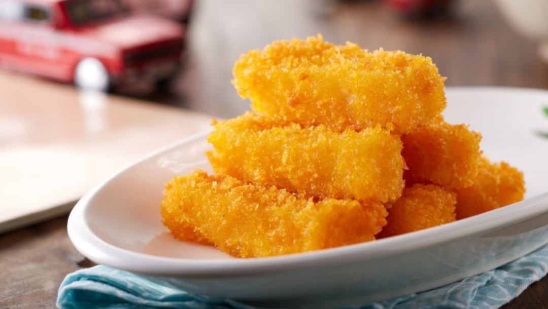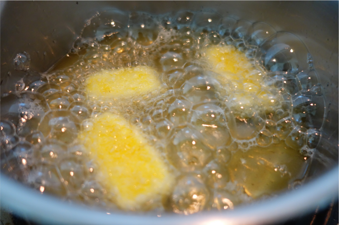7. 炸锅加入比较多的油(推荐使用葵花籽油或者玉米油这类没有味道的植物油),烧到六成热,将裹好面包糠的牛奶条放入炸到金黄(60秒左右),捞出以后放厨房纸吸掉多余的油脂,趁热就可以吃了。
