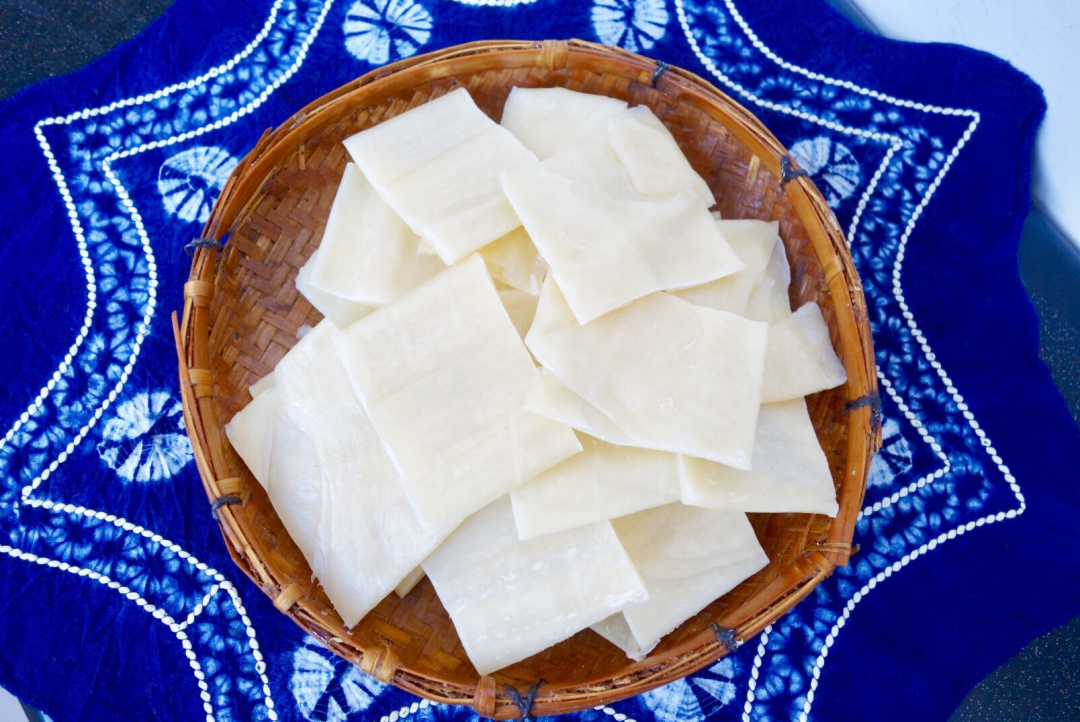 云南十八怪里有一怪叫做“牛奶做成片片卖”,说的其实就是滇西大理白族传统美食乳扇。乳扇以鲜牛奶和木瓜酸水为原料,传统制作工艺一般是新鲜的牛奶点上70℃左右的木瓜酸水,使液体状的牛奶迅速凝固变成奶团,然后经过快速搅拌,使奶团逐渐变成丝状的凝块,再将牛乳凝块整形绷开成长舌饼状,然后用筷子把两头卷起来往外边拉边绷,绕在专门的竹竿上晾干后形成的一种片状的“中式乳酪”。