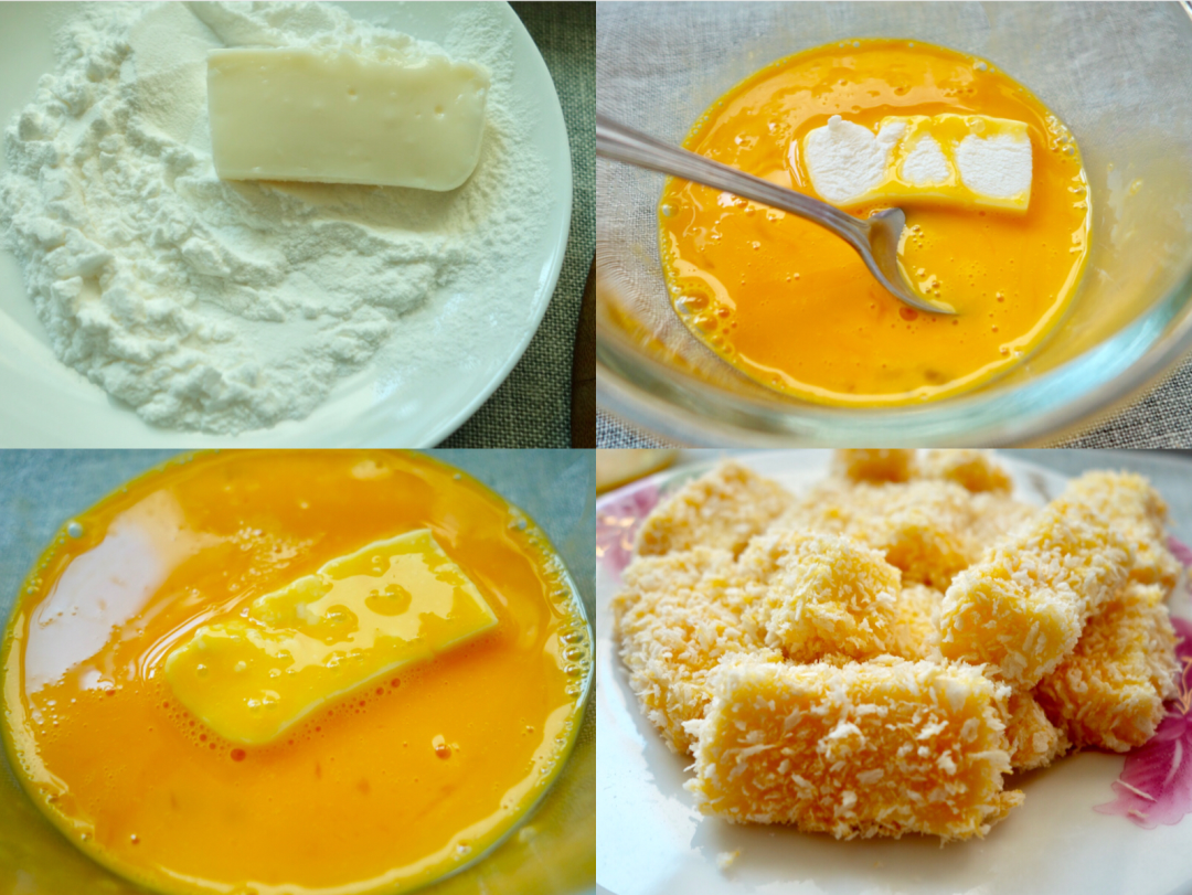 6. 制作炸鲜奶的话则将切成长方形的牛奶块放入淀粉碟子,裹上一层淀粉,转入鸡蛋液中裹上一层蛋液,再放入面包糠碟子裹一层面包糠,就可以准备炸了。