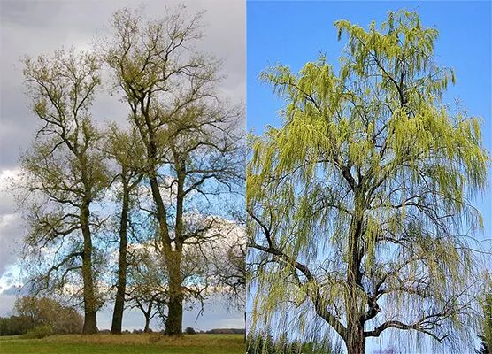 被颠倒的杨与柳,图为黑杨Populus nigra 和垂柳Salix babylonica。图片:Christian Fischer & KENPEI / wikimedia commons
