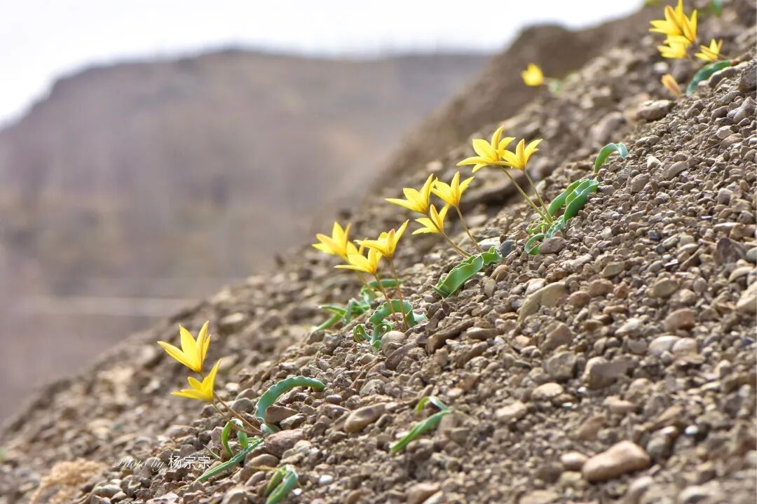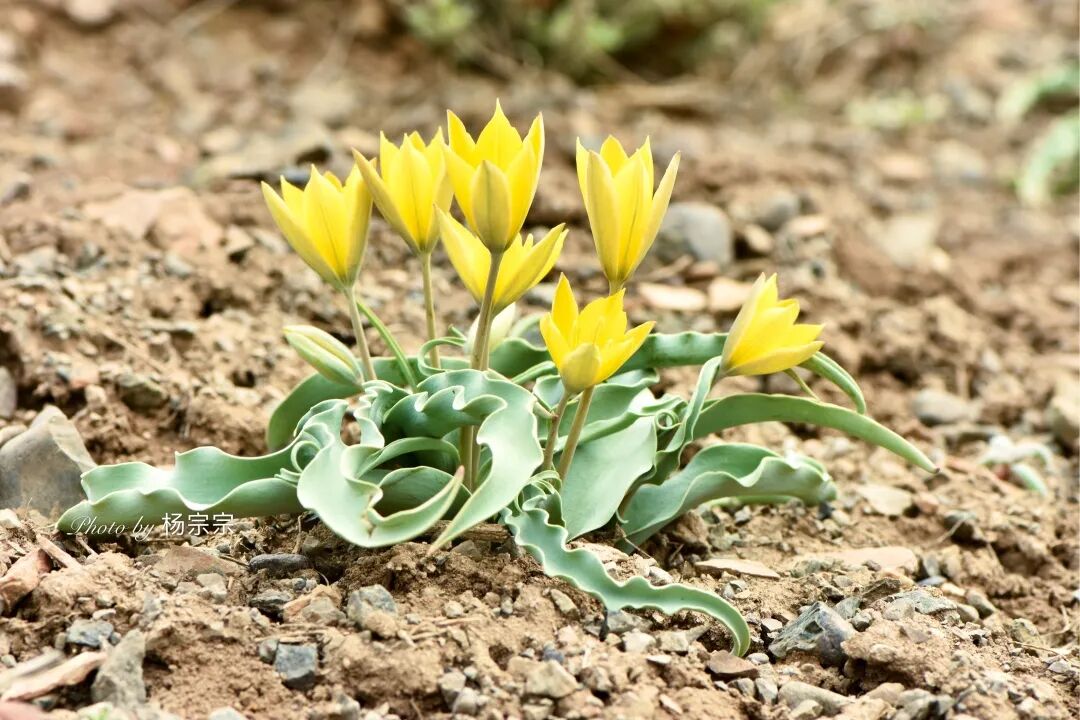 清明时节,如果你在乌鲁木齐周边踏春,那么你一定能看见荒山上的一簇簇金黄。三片波浪式的卷边叶发出蓝绿色的光泽,从下向上逐渐变细;两朵、五朵、甚至十几朵黄花在风中摇曳。它就是中国特有植物——新疆郁金香 Tulipa sinkiangensis。