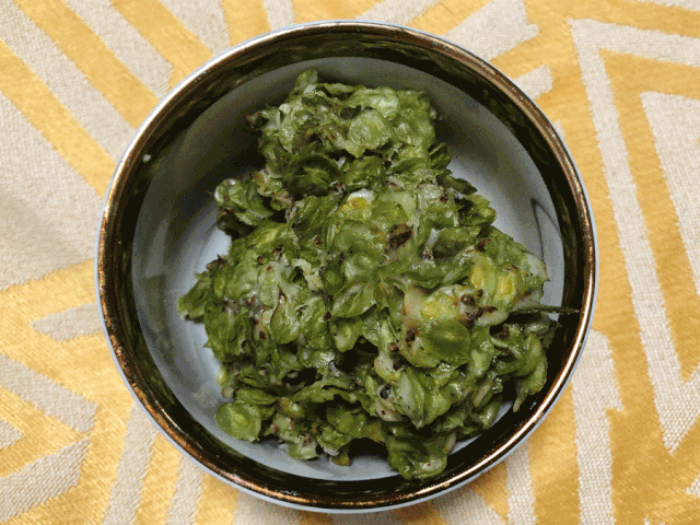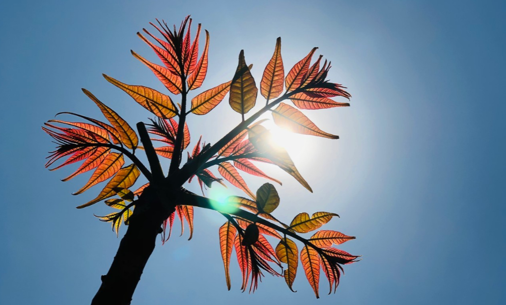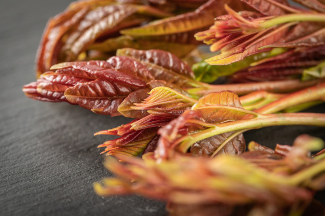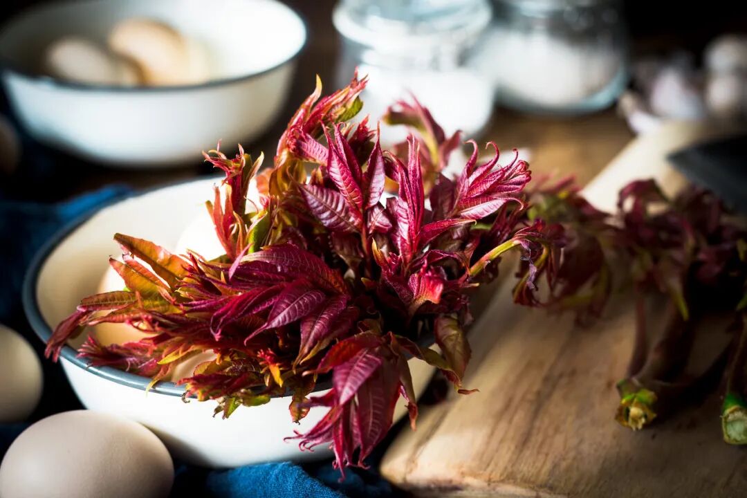 香椿还有个吃法,极考验手艺——沏香椿。嫩红的香椿芽放进大碗里,开水浇下去,合盖焖一会儿,香椿芽的浓郁香气便十足的逸散出来。这时转为嫩绿色的香椿芽,随便拌一拌就够好吃了。