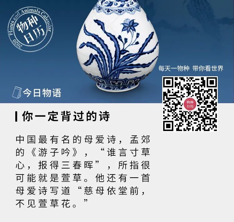 萱草最初用以表达对丈夫的思恋,自唐代弁融的《送徐浩》流传开来,萱草才与母亲联系在一起。“知君此去情偏切,堂上椿萱雪满头”, “椿萱”并用,椿代表父亲,萱代表母亲。而孟郊的《游子》,“萱草生堂阶,游子行天涯。慈母依堂门,不见萱草花。”更是直接把前人的“看萱思夫”的意思演化成了 “种萱孝母”的文化,