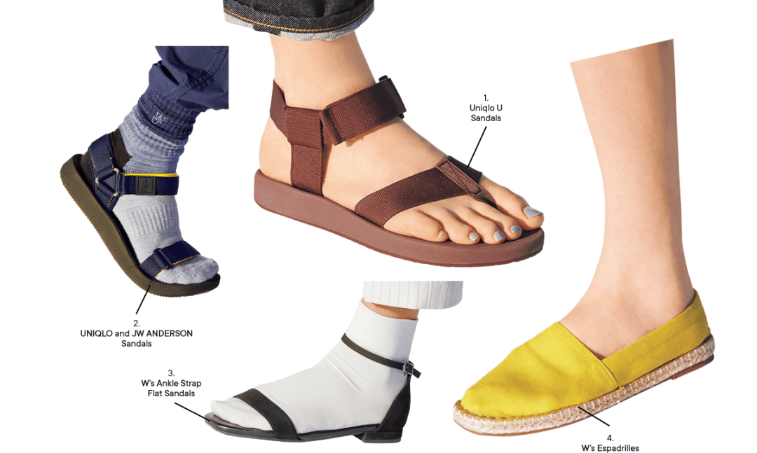 再比如刚刚提到的凉鞋。其实只要认真挑选一下袜子的材质,和凉鞋搭配起来并不会太突兀。或者偷懒一点的话,裸足穿凉鞋+牛仔裤的穿搭也未尝不可。
