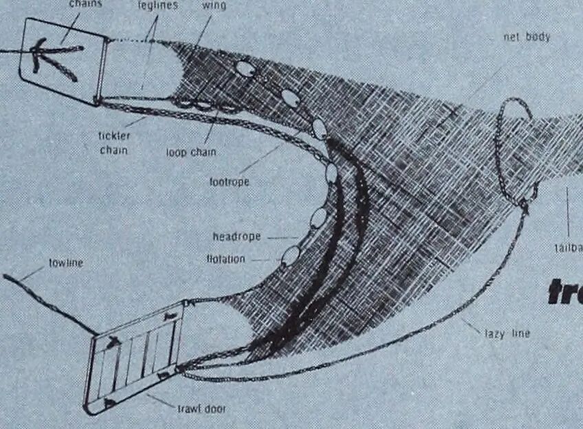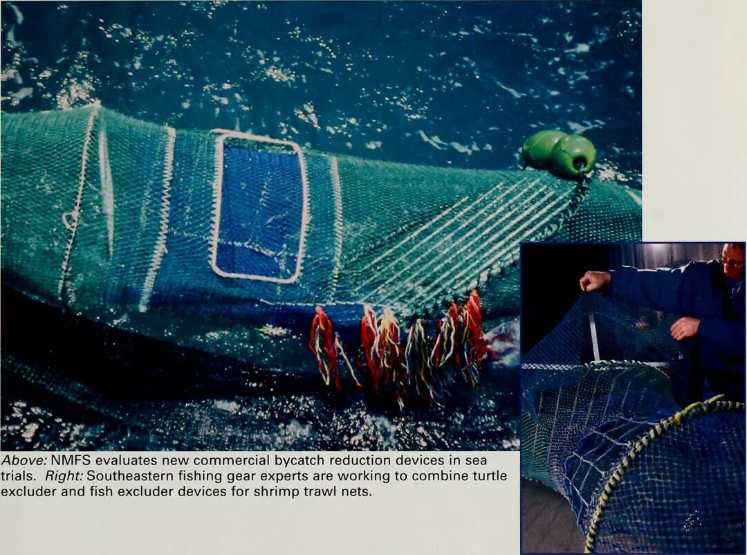 左图为传统的虾拖网。这类网具在使用过程中容易造成海龟兼捕问题,因此后来人们会在网具上加装海龟逃脱装置(右图)。图片:Internet Archive Book Images / flickr