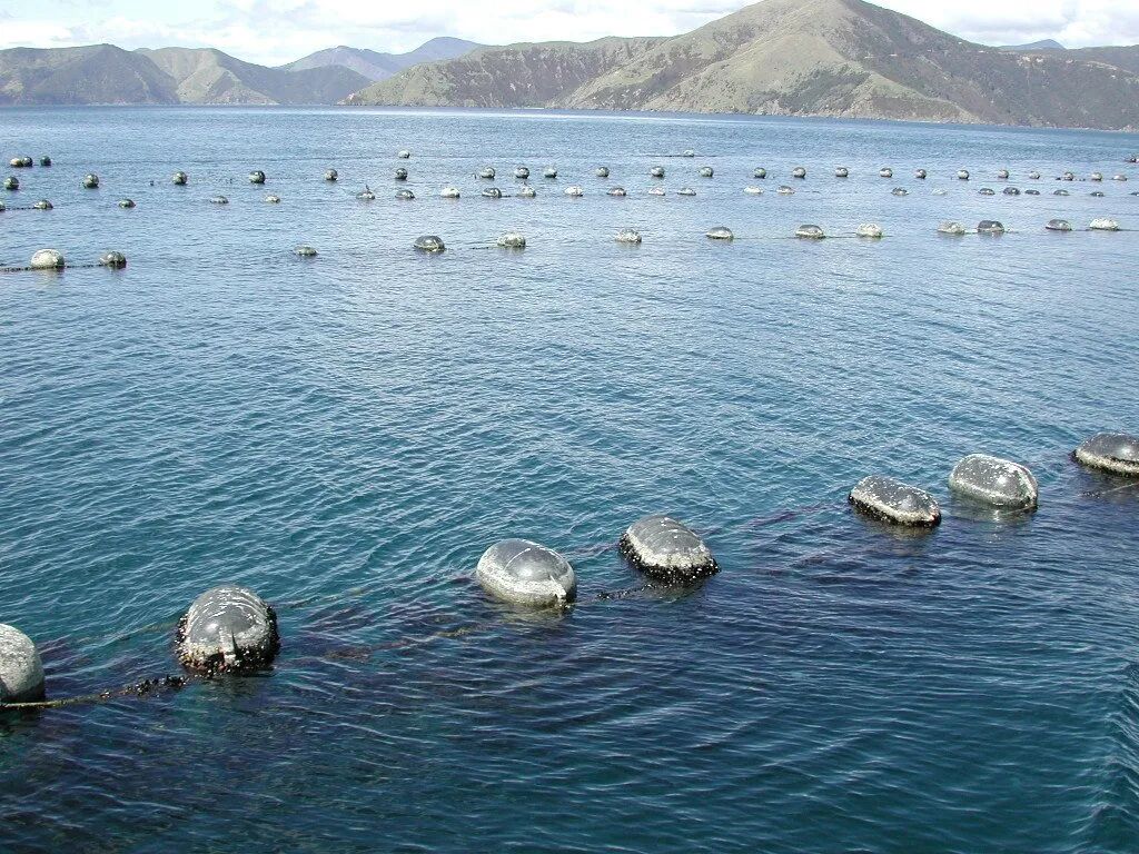 在新西兰的黄金海湾等地区,绿唇贻贝通过绳吊进行周年养殖。它们利用贻贝具有的足丝牢牢抓住绳索,任凭大风大浪均无法绳贝分离。图片:Pseudopanax / Wikimedia
