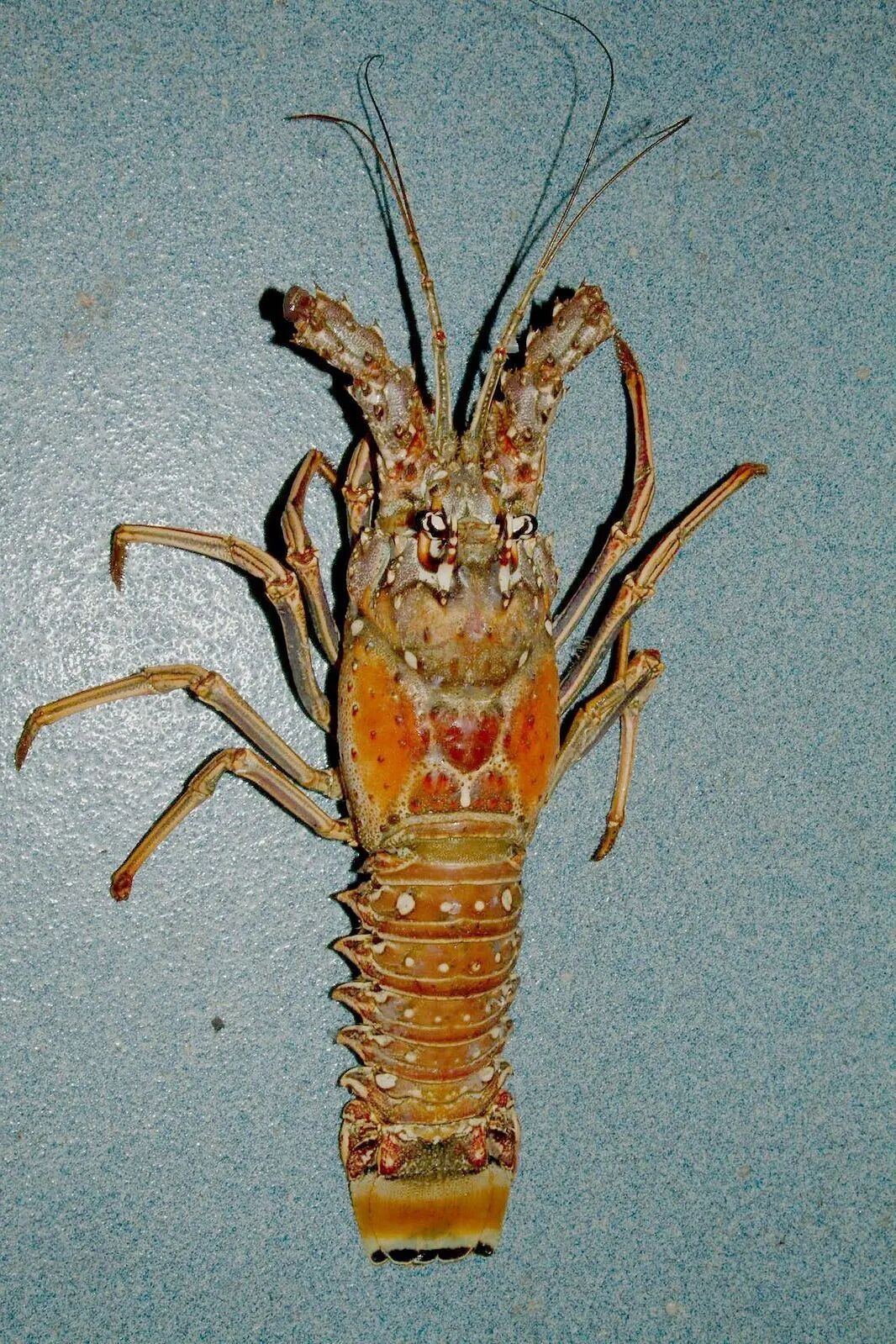 一只抱卵的波龙。可以看到龙虾尾左侧有剪V角,用以区分处在繁殖期的母虾。第一次捕到时如果发现波龙已经抱卵,就做标记之后扔回海里。图片:NOAA / Wikimedia