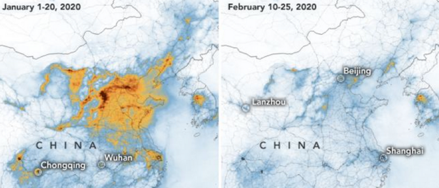 NASA近期的卫星照片显示,和1月1日到1月20日相比,2月10日到2月15日这15天里,华北地区上空的二氧化氮水平明显下降。NASA解释说,这种情况“至少有部分”是防控疫情的结果——要知道,二氧化氮是汽车和工厂排放的有害气体中主要污染物之一。