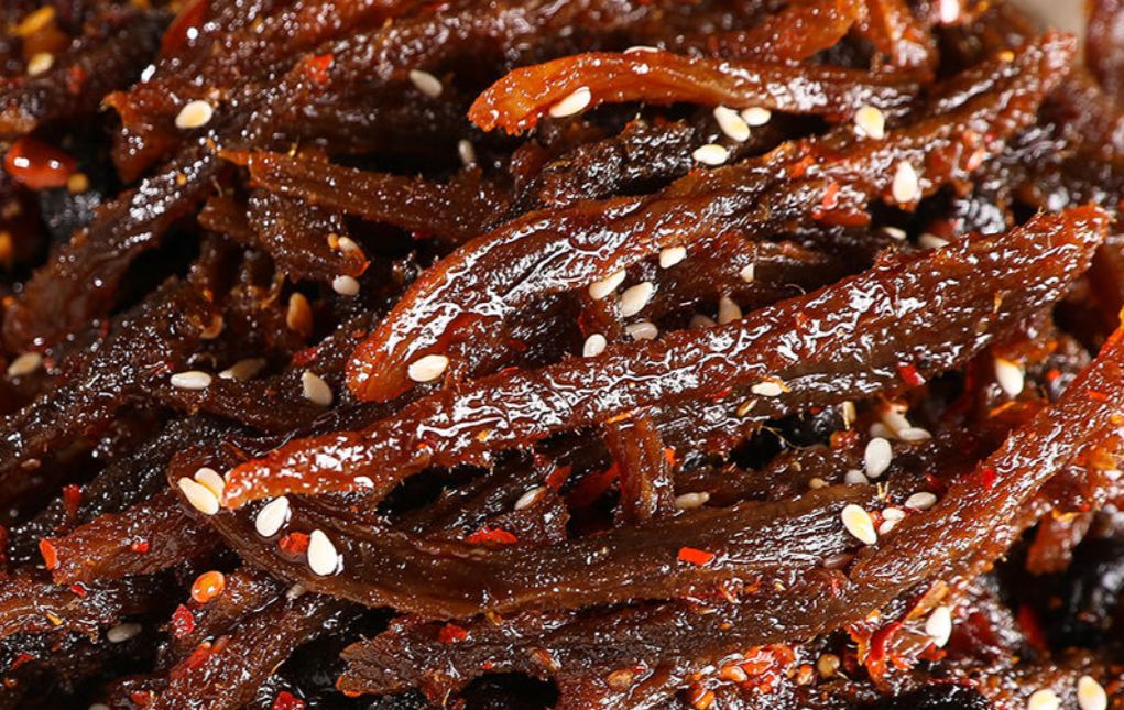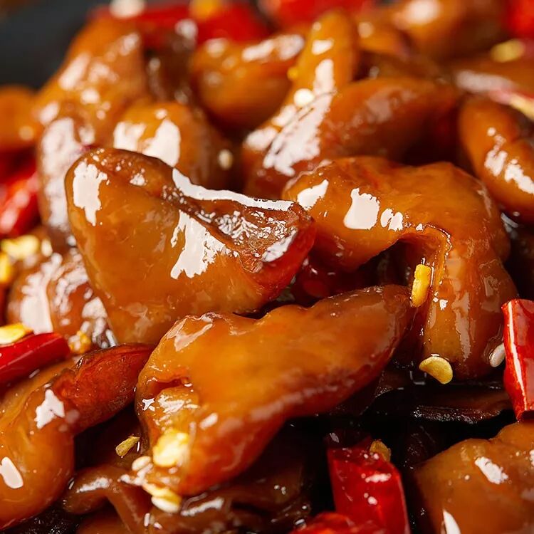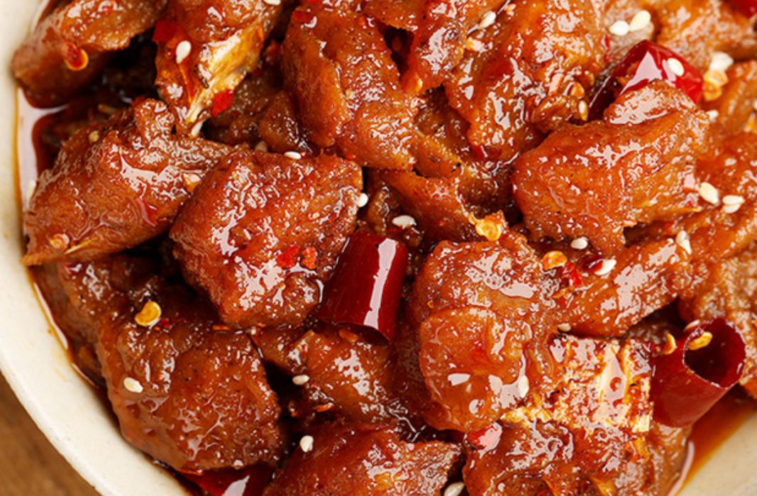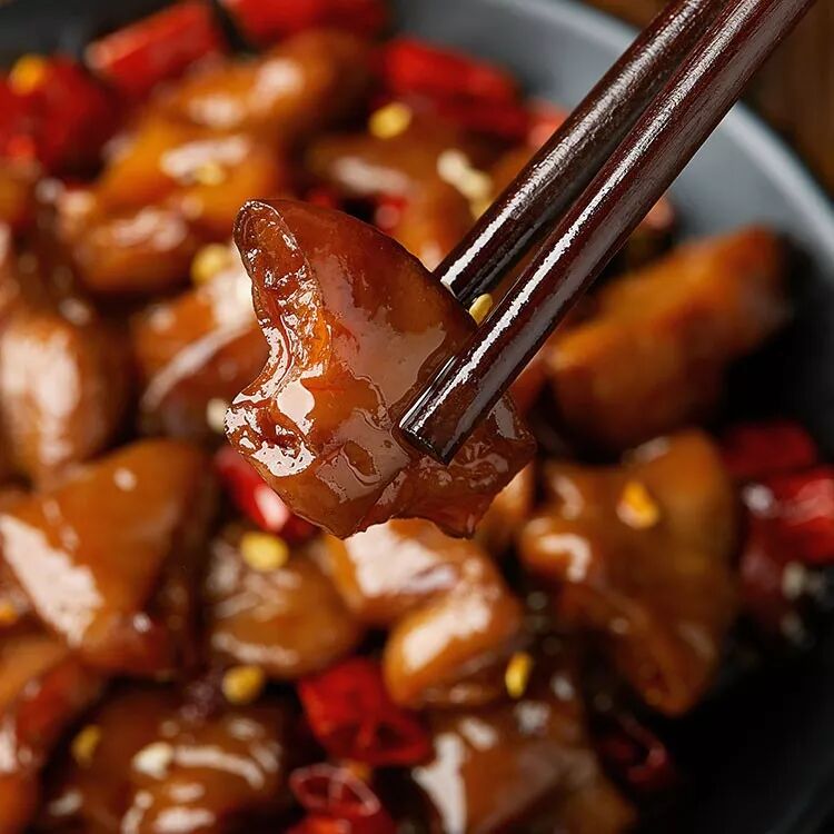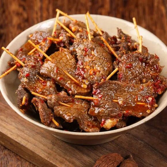 选用跑山兔的兔腿,腿部肌肉紧实有嚼劲,每一口都能吃到实在的肉。每一只兔腿清洗干净后,都会在秘制卤料里腌制2小时,让味道渗入其中,再炒到喷喷香。纯正的四川味道,麻辣鲜香,越嚼越好吃。香辣兔头满足喜欢啃骨头的小伙伴。啃一只兔脑壳,是拆卸的美食美学,细细地慢慢地将香嫩兔肉里的滋味嘬出来,和吃小龙虾有异曲同工之趣。干香麻辣的麻辣牛肉,油润适口,外表酥香有劲道,肉质紧实有弹性,也吃在嘴里就能让人体会到吃肉的幸福。麻辣牛肉吃起来就停不下嘴,吃完还要舔舔手指才过瘾!细嫩的肉条,在秘制调料的浸染下,焕发出诱人的色泽,隔着屏幕都能感受到它们的香气。