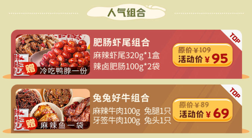 肥肠不用多说了吧!吃货小铺引起过吃所十级骚动的明星产品!每次一上架都是爆卖20000袋,直接卖断货。所长只能是断断续续地开闸,卖货卖到连自己都吃不上(哭唧唧)。它不仅是肥肠爱好者的心头好,就连不吃肥肠的小姐姐对着它也大快朵颐。吃这个肥肠还有个秘诀:加热后能把人馋疯!一定要记得加热一下哦!虾尾是今年新的爆品,在一个功利型吃货眼中,吃小龙虾就是图小龙虾的肉,虾尾才是小龙虾正义!掐头去钳,5斤小龙虾才能出1斤虾尾,吃过的都说好!弹嫩的虾肉裹着红色的汤汁,咻地一下弹出来,麻辣味刺激着神经,越吃越兴奋。而且这款虾尾真的很入味,调味渗透肌理,吃完了手上都还是诱人香味。开袋后微波炉加热5分钟,或者热水浴5分钟,简直就和刚出锅时没啥差,一不小心就嗑见底了。现在强强联手,1盒小龙虾虾尾+2袋辣卤肥肠原价109元,限时优惠只要95,还送一份价值19.8元的鸭脖!