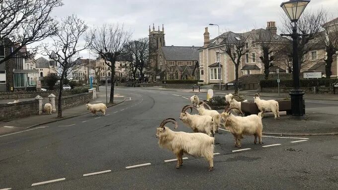 趁着人们“禁足”在家,附近的山羊三五成群进城观光——人类活动才刚刚“衰退”一个月,大自然就吹响了“反攻”的号角。