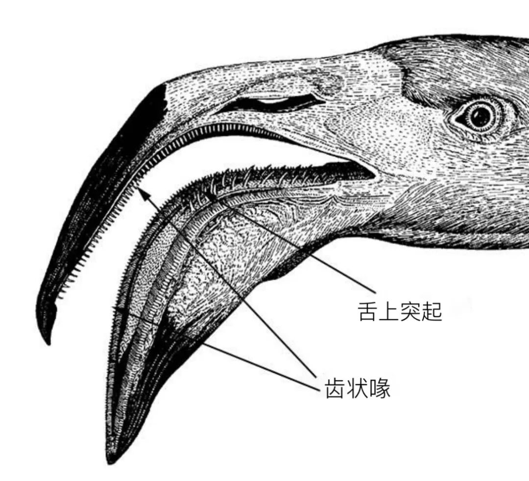 红鹳属火烈鸟的喙部特写。图片:Zweers et al. / Journal of Avian Biology (1995);标注:葛致远