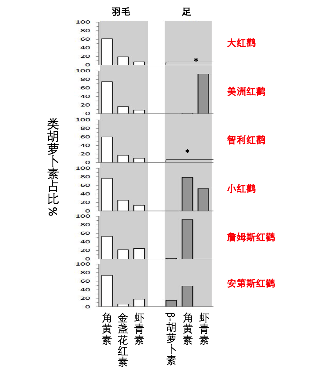 在六种火烈鸟的羽毛和足部中检测到的红色类胡萝卜素情况(*号代表无数据)。图片:Amat & Rendon / Flamingos. Behavior, Biology, and Relationship with Humans (2017)