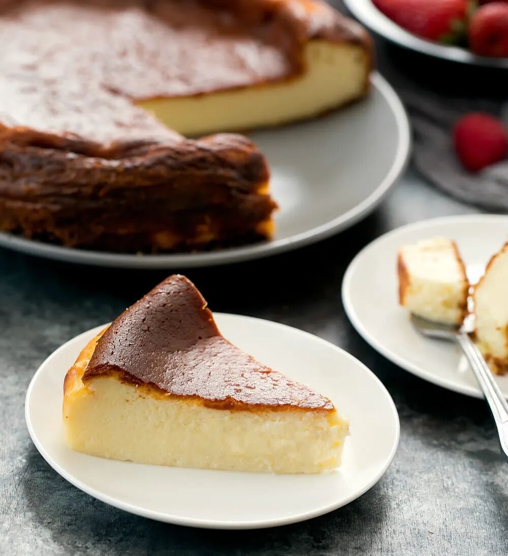 西班牙和法国是奶制品产区也是乳酪大国,但这里并没有做芝士蛋糕的传统,更习惯使用清淡的山羊/绵羊奶酪来制作甜品。而重芝士蛋糕使用的则是直到十九世纪末才被美国乳商发明出来的奶油奶酪,以浓郁醇厚、丝滑细腻见长。如何将重口味的纽约芝士蛋糕改良成适合巴斯克人的样子呢?Chef Rivera在采访中称,当时他翻阅众多料理书籍,尝试不同的配比与组合,最终选择了西班牙当地的奶酪品种——高盐、少乳脂的San Millan奶油奶酪,让蛋糕的口感更加柔滑、香气更加浓郁、口味更加平衡。La Viña的巴斯克芝士蛋糕 | pintxos.es另外还提升了烘烤的温度,缩短了烘烤的时间。短暂的高温在蛋糕表面发生美拉德反应制造出迷人的香味,又阻止过度焦糖化会带来的不良风味物质,同时也造就了表皮和内部组织的不同成熟度,充分冷却后会回缩成标志性凹陷的顶部,但如果趁热切开则会呈现半熟的流心状态。巴斯克芝士蛋糕的标志性凹陷顶部 | sansebastianturismoa.eus由于烤制时采用水浴的方式,重芝士蛋糕有着更细腻的组织和更平整的表皮,显得精美许多。而巴斯克芝士蛋糕似烧焦一般的粗犷外表和诱人味道形成了强烈反差,让La Viña餐厅的芝士蛋糕在当地迅速流传开来,很快在周边的城市出现了模仿版本,造访美食之都的游客和来这里采风的各国主厨们更是将其声名远播。