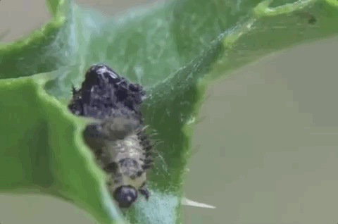 Plagiometriona clavata是一种叶甲科的甲虫,幼虫防御捕食者的方法十分奇特——身体后部背着一块盾牌,这是用自己的屎和蜕皮做成的。遇到刺激,它就把后半截腹部抬高,举起“屎盾”使劲摇晃,企图挡开捕食者。