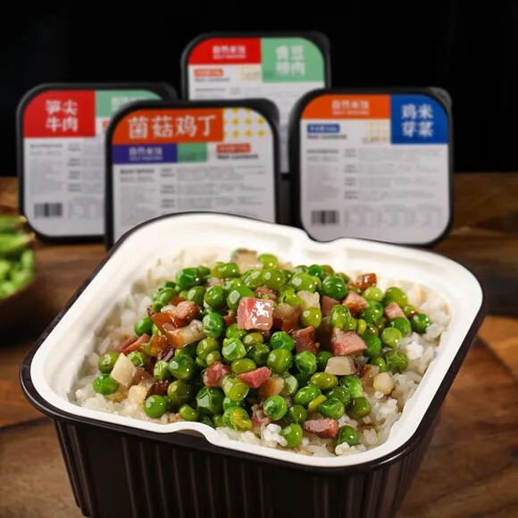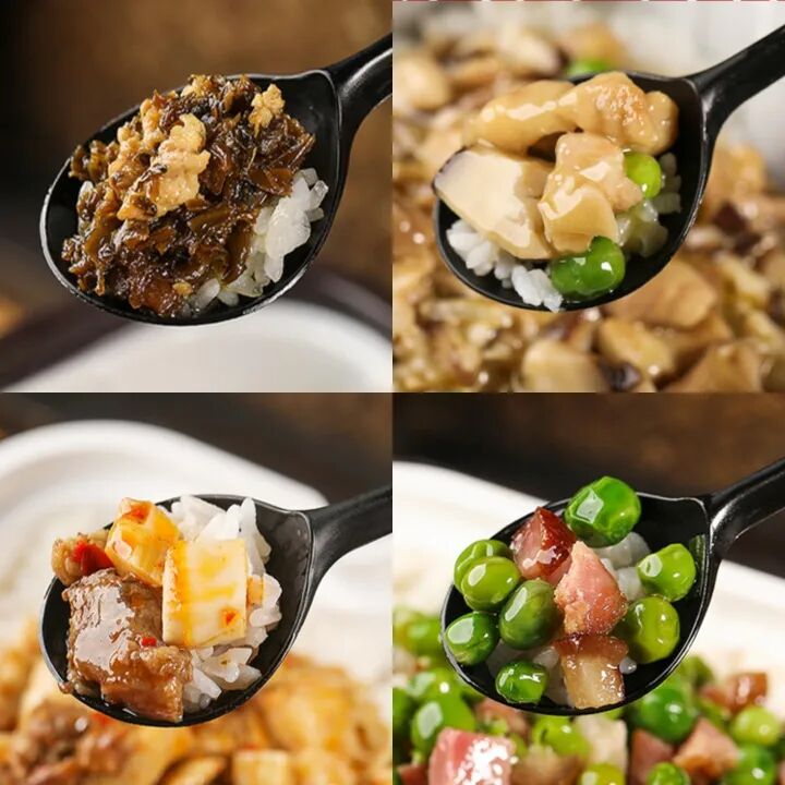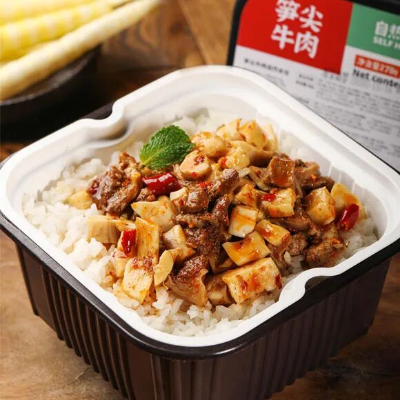一共4种口味:鸡米芽菜、菌菇鸡丁、笋尖牛肉、青豆腊肉。都是双菜包,双倍满足,川式的调味非常下饭。只需要等待15分钟,就能吃到一盒热气腾腾的盖饭~