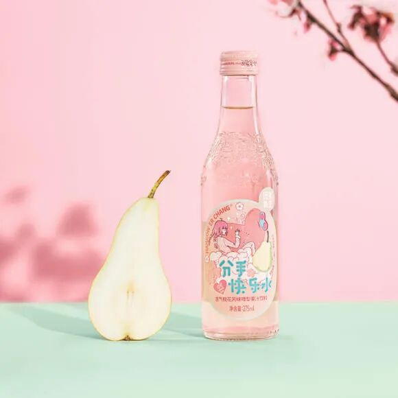 分手快乐水添加了10%的啤梨果汁,加入冰水或者放入冰箱冷藏,瓶身上梨子图案部分也会有字出现噢~