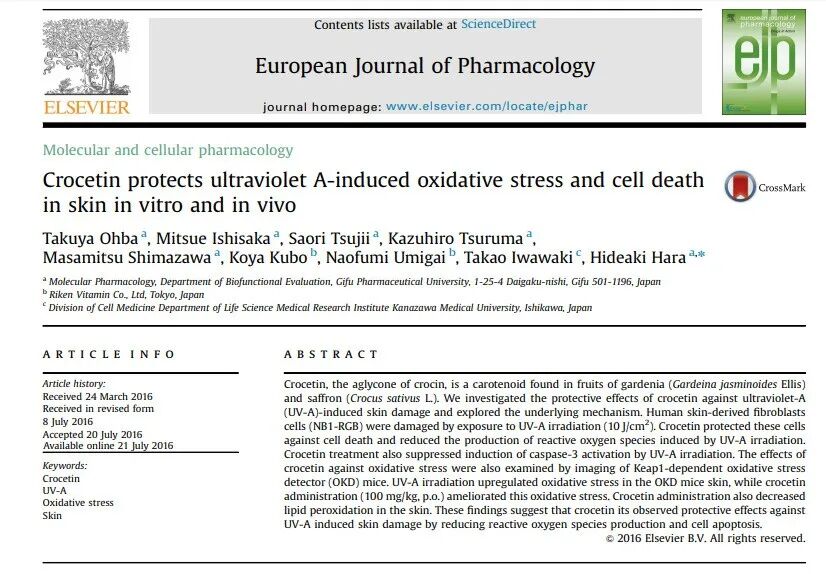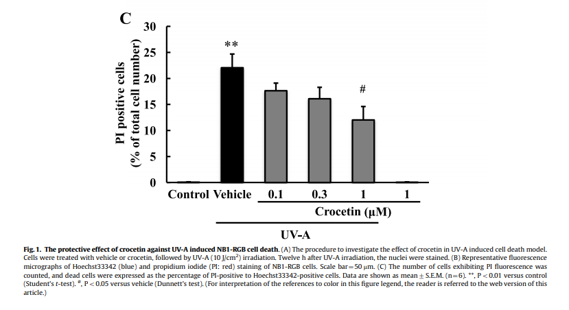 [1]Takuya, Ohba, Mitsue, et al. Crocetin protects ultraviolet A-induced oxidative stress and cell death in skin in vitro and in vivo[J]. European Journal of Pharmacology, 2016.