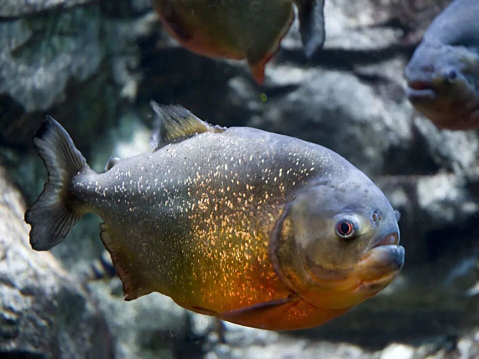 淡水白鲳的幼鱼同样具有鲜红的腹部,看起来有点儿食人鱼的味儿,不过这个特征成年后就会逐渐消失。左:淡水白鲳幼鱼,右:纳氏臀点脂鲤(红腹食人鱼)。尽管恶名在外,但红腹食人鱼很少主动袭击人类。图片:Wisky、Gregory Moine / Wikimedia