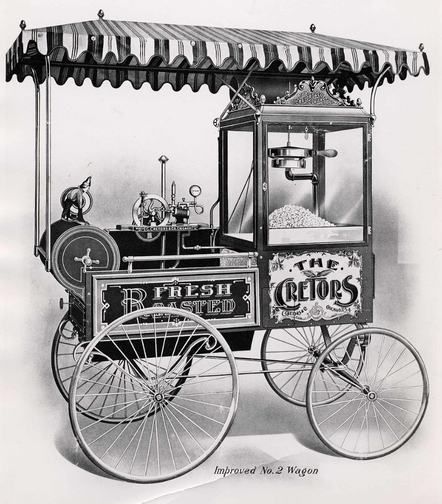 玉米经过简单的加热后就会膨胀,形成的就是这种蝶形爆米花。早在3000多年前驯化玉米的印第安人就已经掌握了做这种爆米花的技术,而将其推广成为一种全球性食品的则是一位名为查理斯·克里斯特(Charles Cretors)的美国人的功劳。在1893年查理斯改良了爆米花机将其小型化并装上了轮子,把这玩意儿带到了芝加哥世博会,之后爆米花摊就风靡于西方国家。