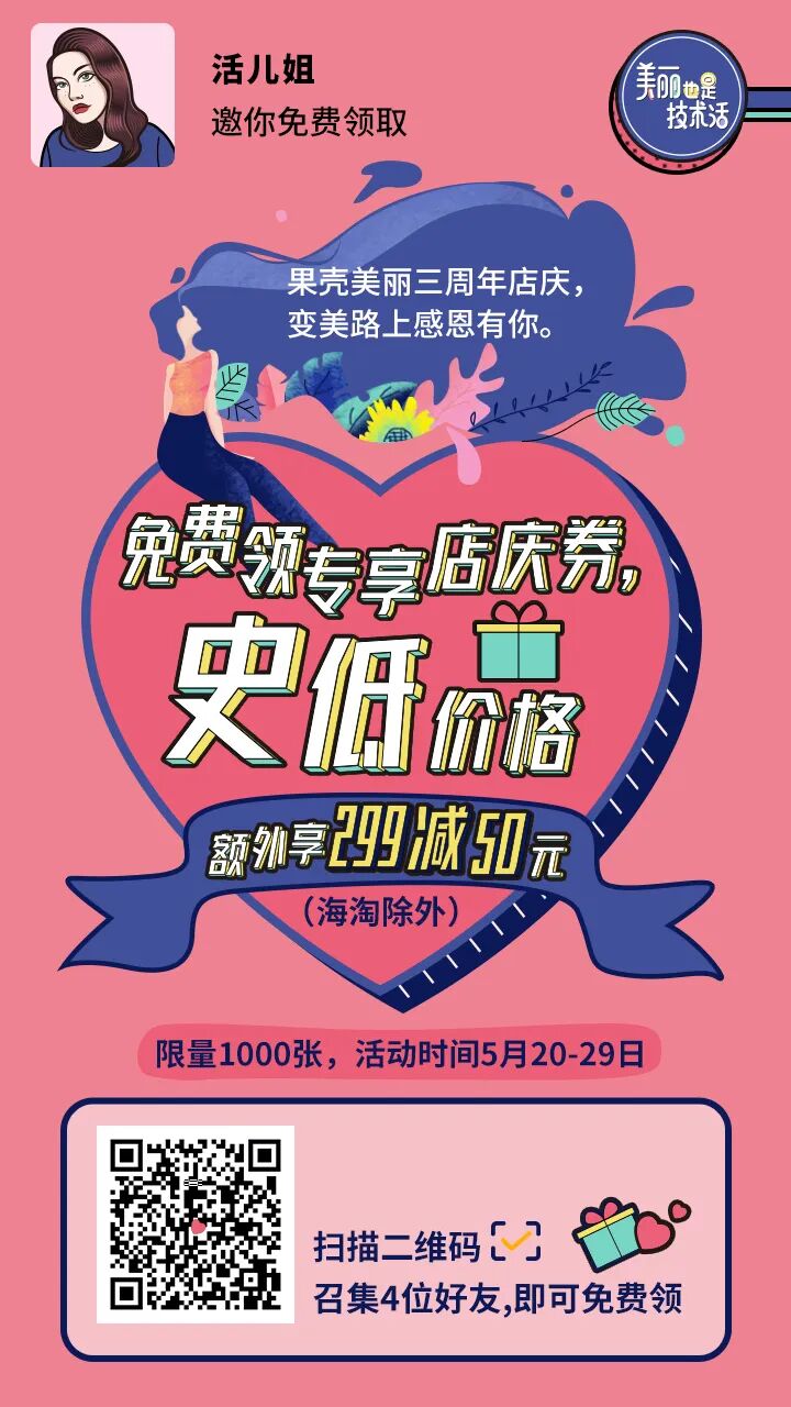现在点击海报扫码,获取你的专属海报,邀请4位好友助力,就可获得满299减50的大额优惠券一张!